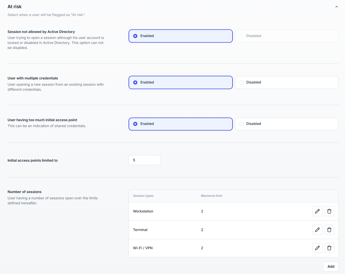 Restrict concurrent logons and set a limit for simultaneous sessions to better prevent shared credentials and unauthorized access.