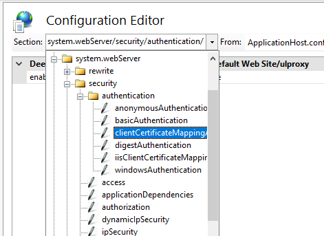 system.webServer > security > authentication > clientCertificateMappingAuthentication = true