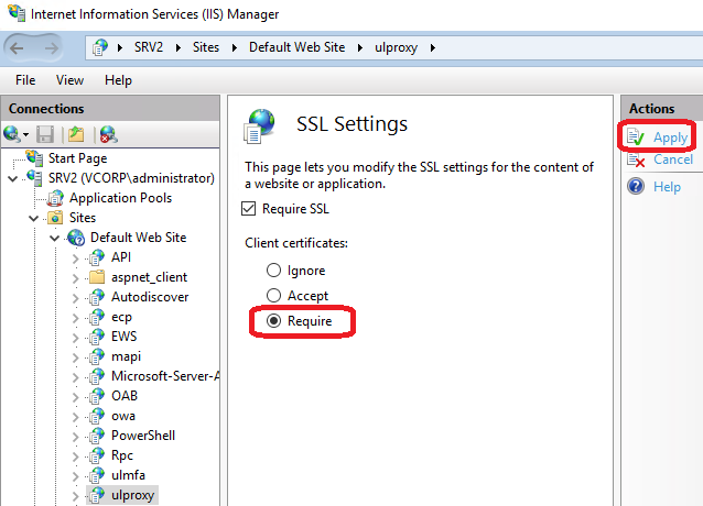 SSL settings selection in the UserLock Anywhere IIS application (ulproxy)