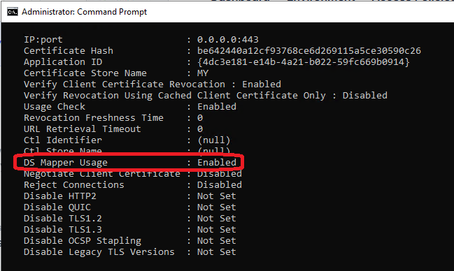 In some cases, the Active Directory Client Certificate Authentication feature doesn’t work immediately because the HTTP SSL binding lacks the required DS Mapper Usage option.