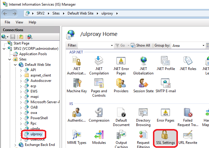 1. On the IIS server hosting UserLock Anywhere, open the SSL Settings of the ulproxy application.
