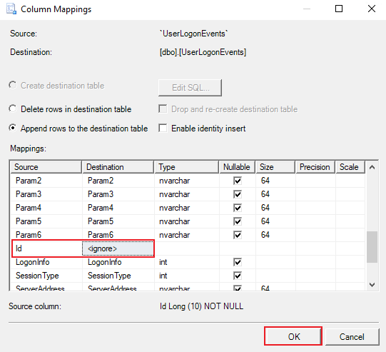 • In the Column mappings window, set the ID column to Ignore, then click OK.