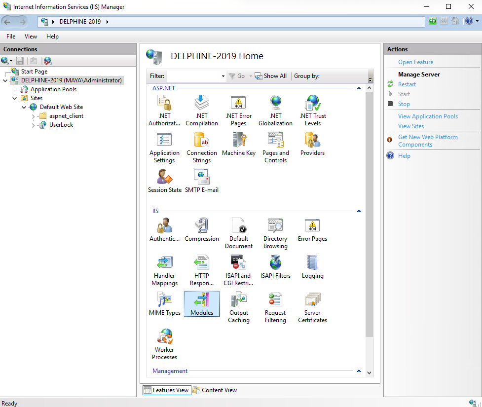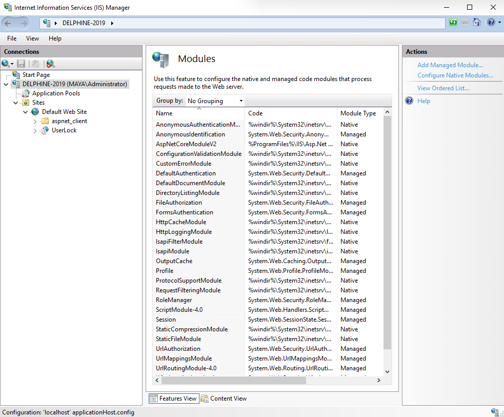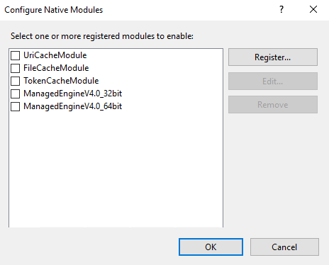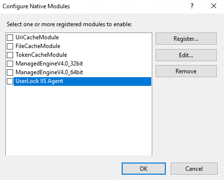 At the server level, open Modules → Configure Native Modules…, select the UserLock IIS Agent, and click Unregister.