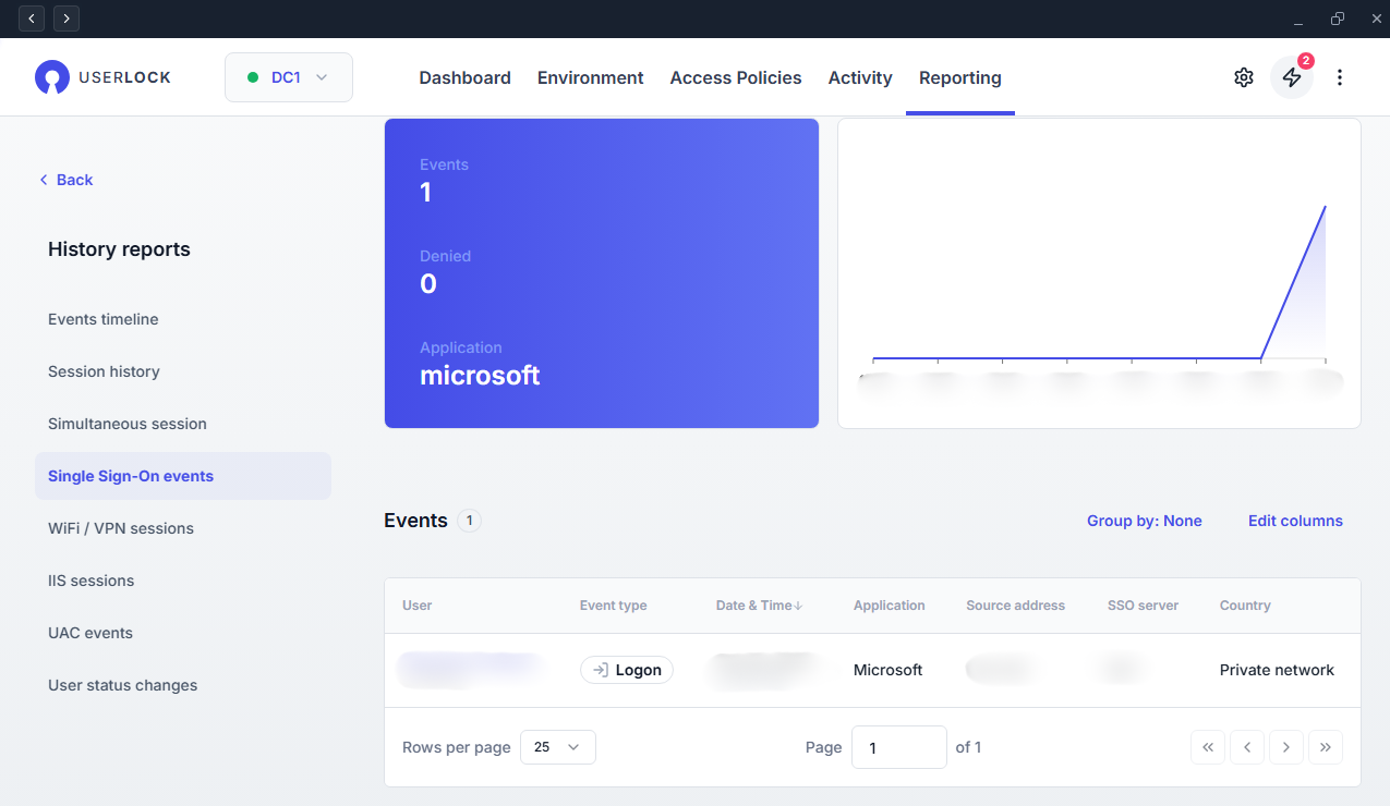 In the UserLock Console, go to Reporting ▸ History reports ▸ Single Sign-On events to verify the connection.
