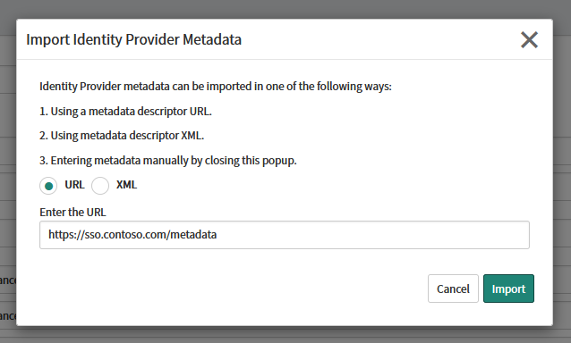 In the Import Identity Provider Metadata dialog box, choose URL and enter: