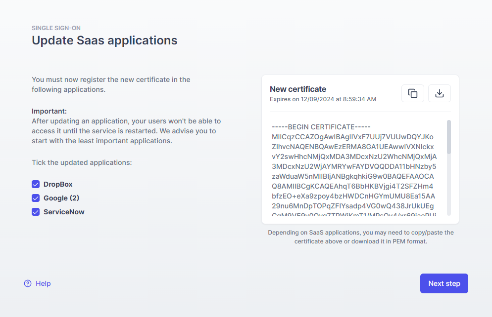 Users will not be able to sign in to any federated application until the new certificate is fully applied and the SSO service restarts.