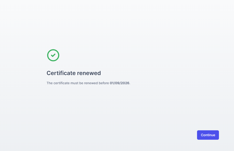 2. A confirmation screen then shows the new certificate expiration date. Click Continue.
