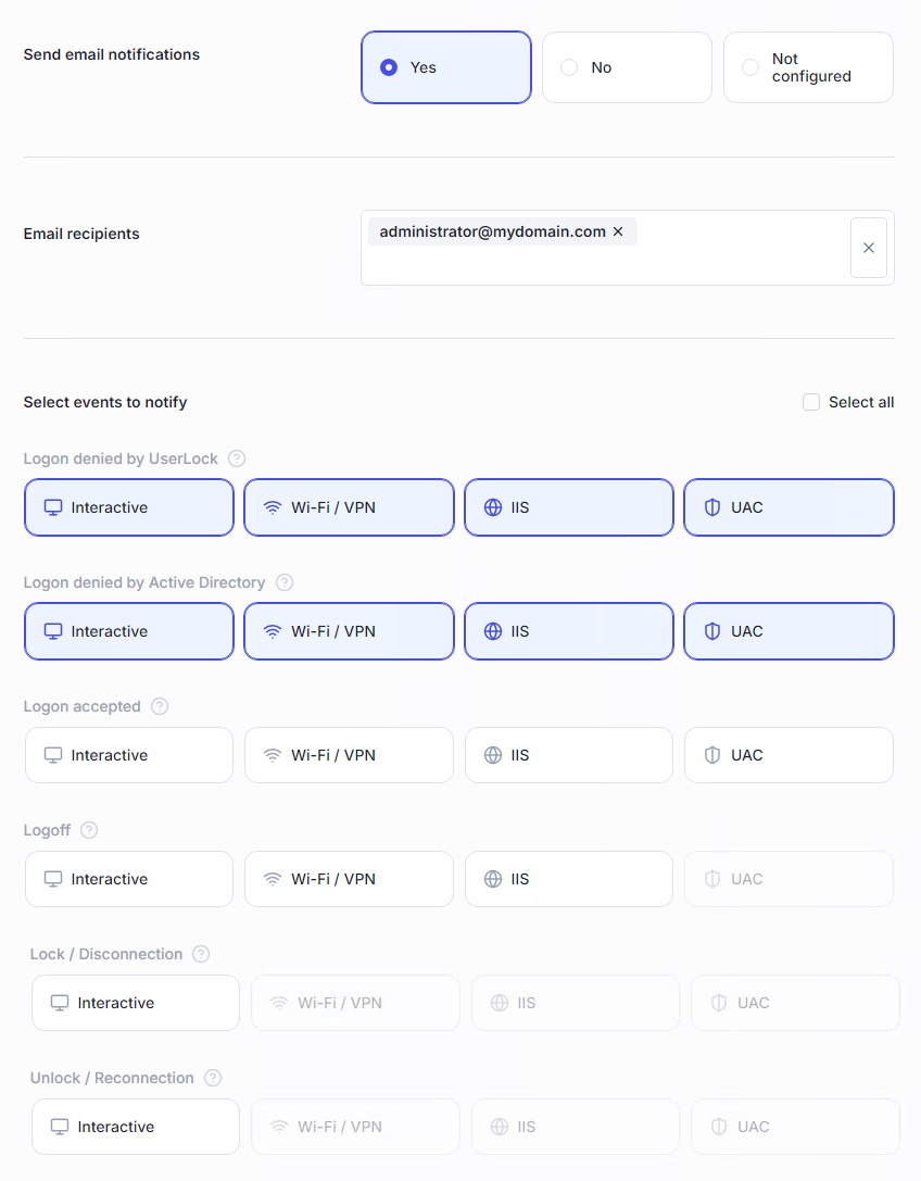 Choose which events will trigger an email (denied logon, accepted logon, logoff, lock, etc.).
