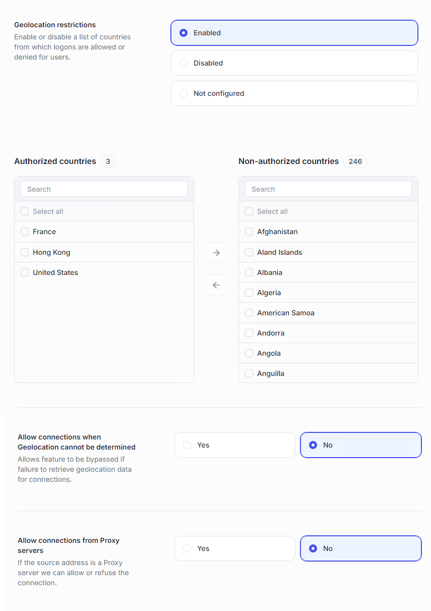 Geolocation restrictions control remote logons based on the user’s country.