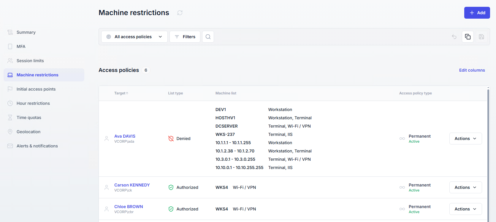 A list of all machine restriction policies is available in the Access Policies section, under the Machine restrictions page.