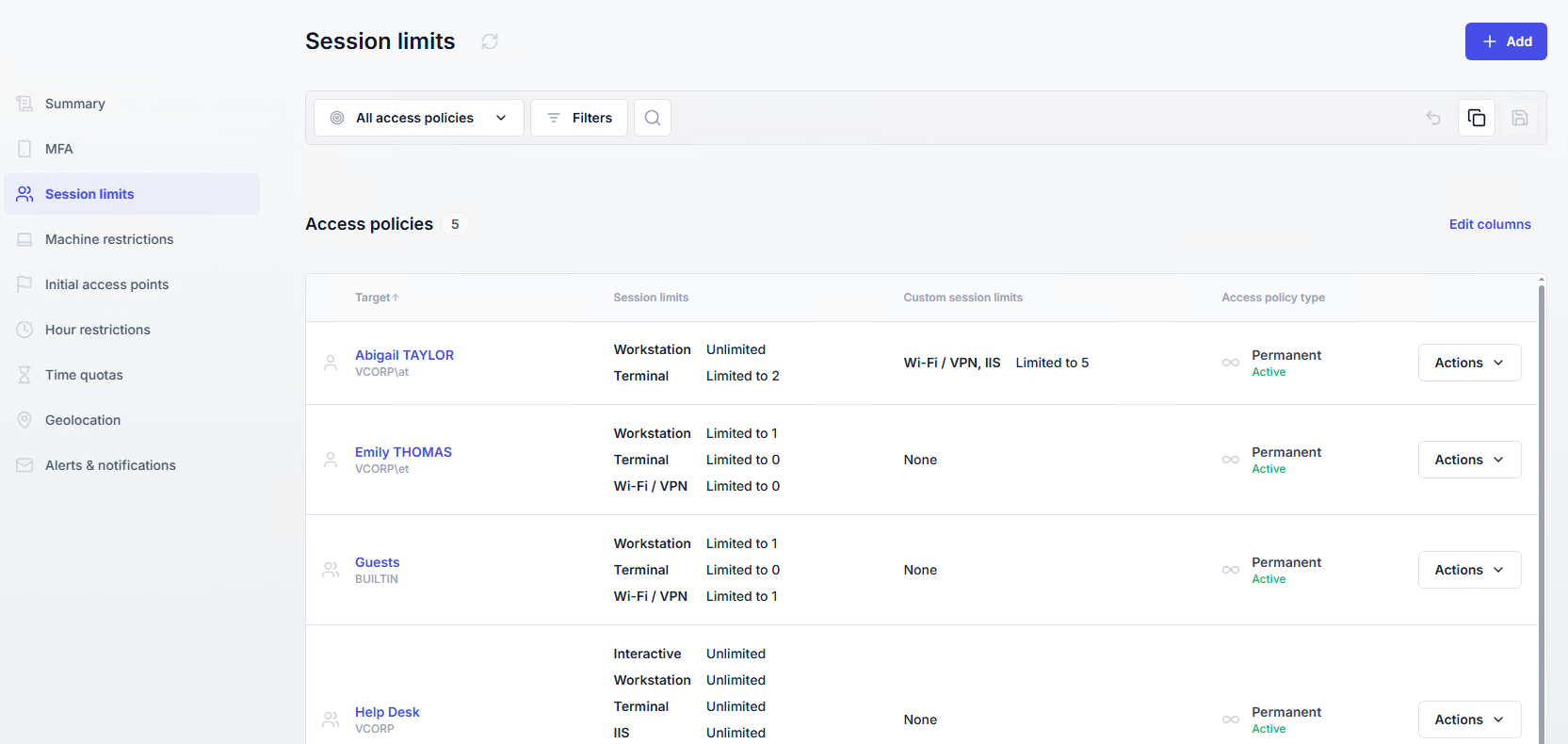 A list of all session limit policies is available in the Access Policies section, under the Session limits page.