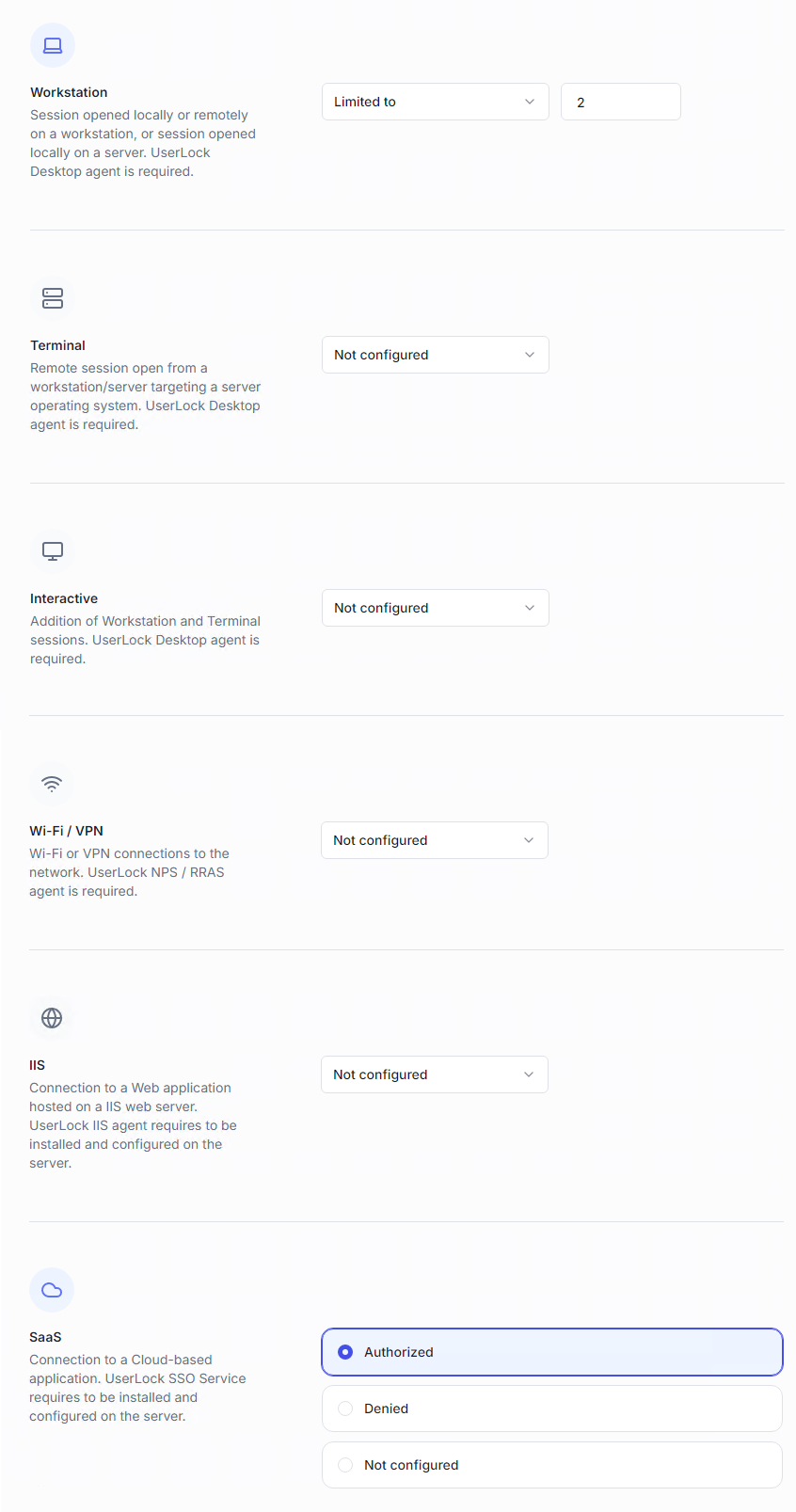 • For each session type (Workstation, Terminal, Interactive, Wi-Fi/VPN, IIS, SaaS), you can set: