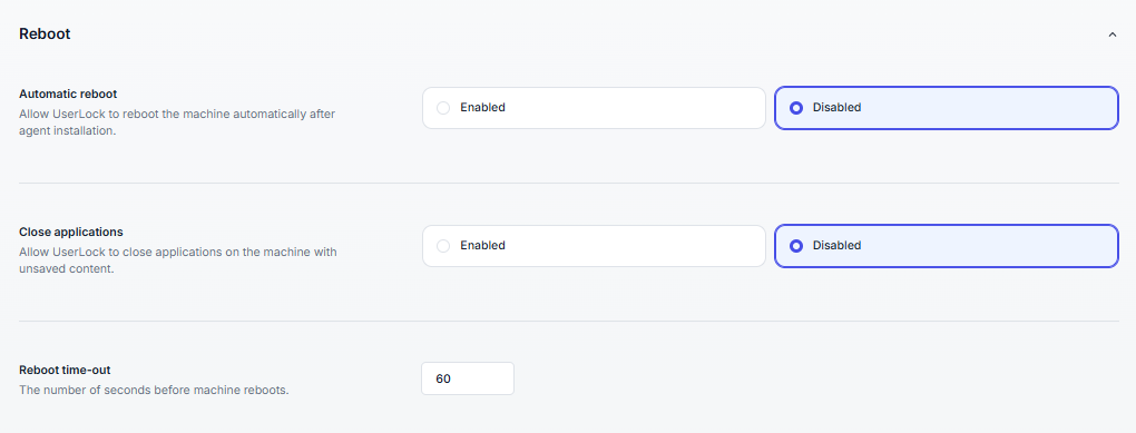 These reboot settings let you control how UserLock manages restarts on target machines, ensuring protection is correctly applied while balancing user experience and security requirements.