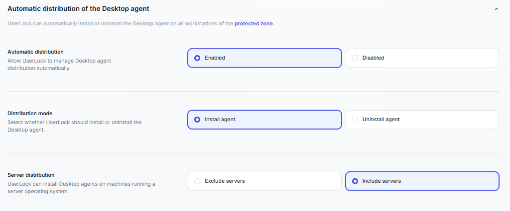 Distribution mode | Defines whether UserLock installs or uninstalls the Desktop agent. Install agent will also update agents that are out of date. |
