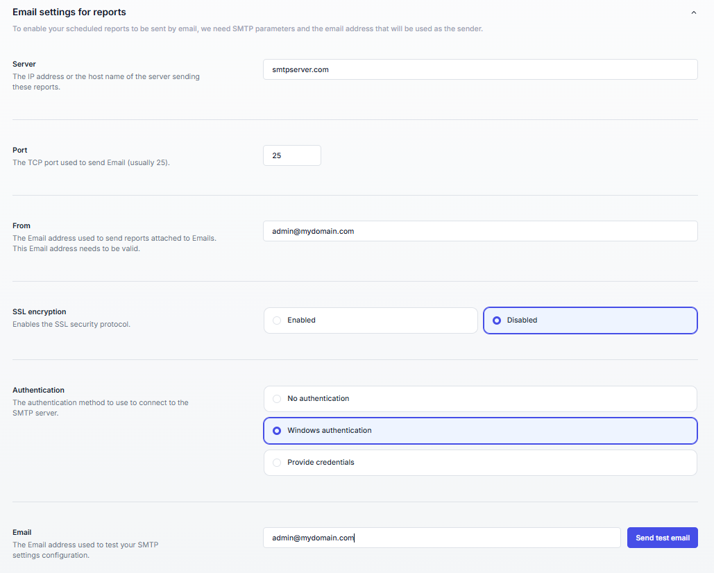 To send documents by email at scheduled times, the UserLock console requires the SMTP settings of your mail server and the email address that will be used as the sender address.