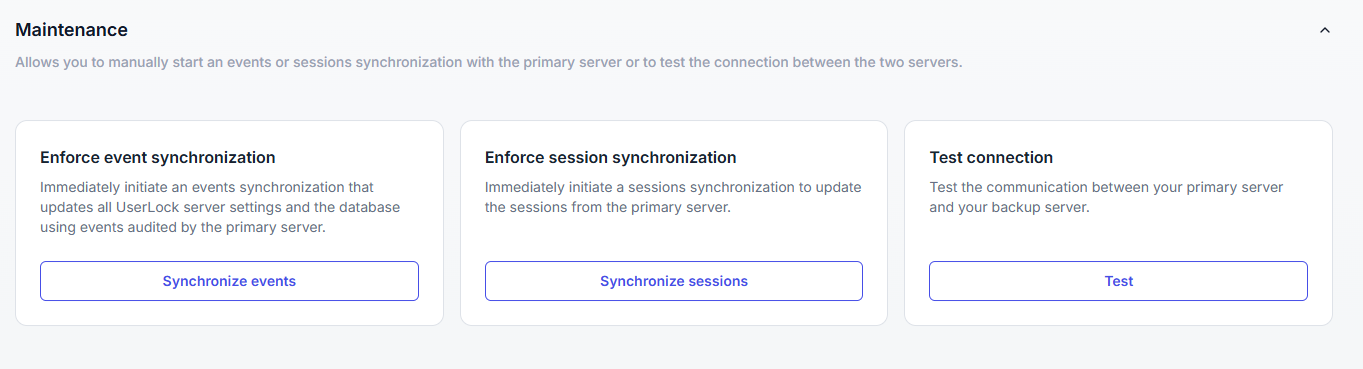 This section lets you control synchronization between Primary and Backup servers. It is only displayed on a UserLock server configured with the Backup server role.