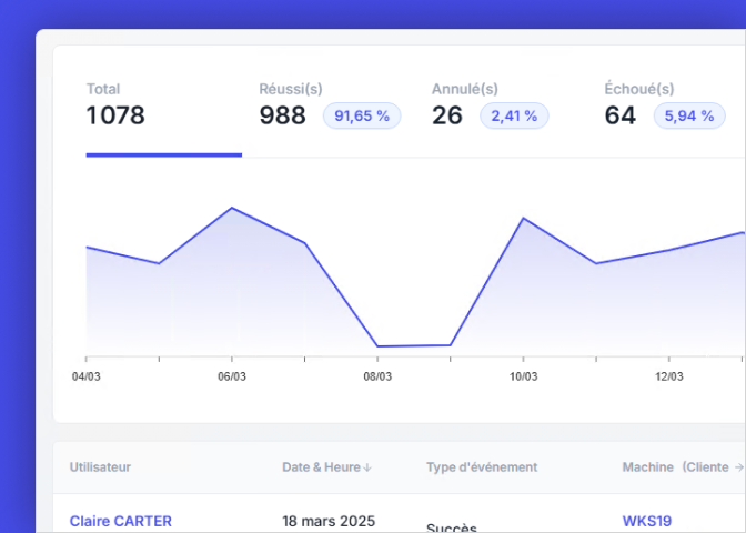 UserLock vous permet également d'auditer toutes les tentatives d'accès et les accès réussis à vos systèmes, avec des rapports filtrables et consultables à partir d'un tableau de bord unique. Vous pouvez programmer des rapports personnalisés ou prédéfinis, et même les envoyer directement depuis la console.