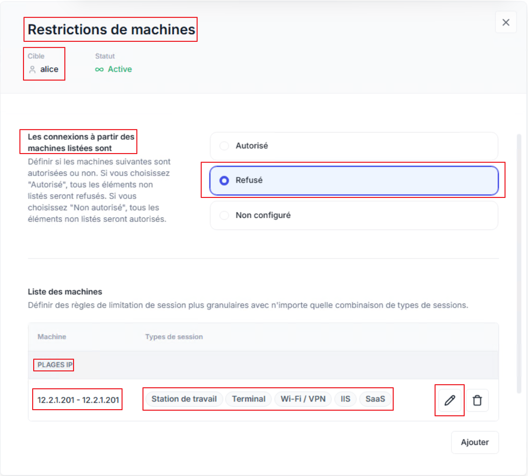 Définissez Les connexions à partir des machines listées sont sur Refusé.