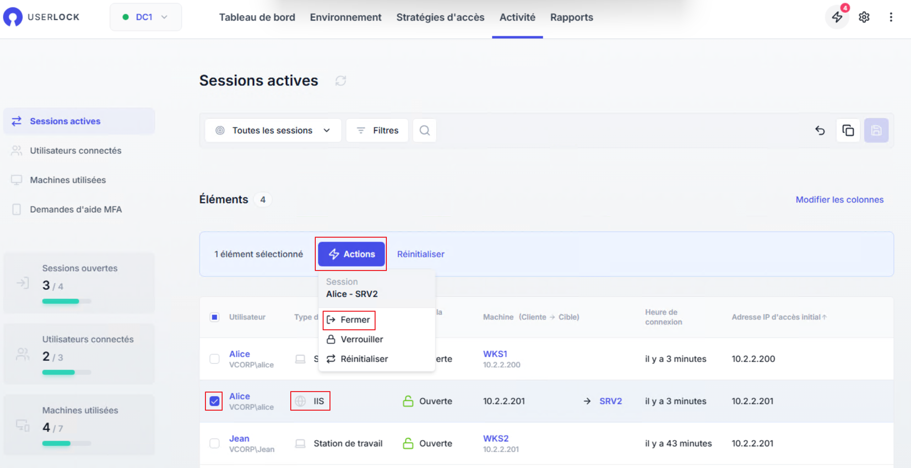 Dans la console UserLock ▸ Sessions actives, une nouvelle session IIS apparaît, correspondant à l’accès à la boîte aux lettres.