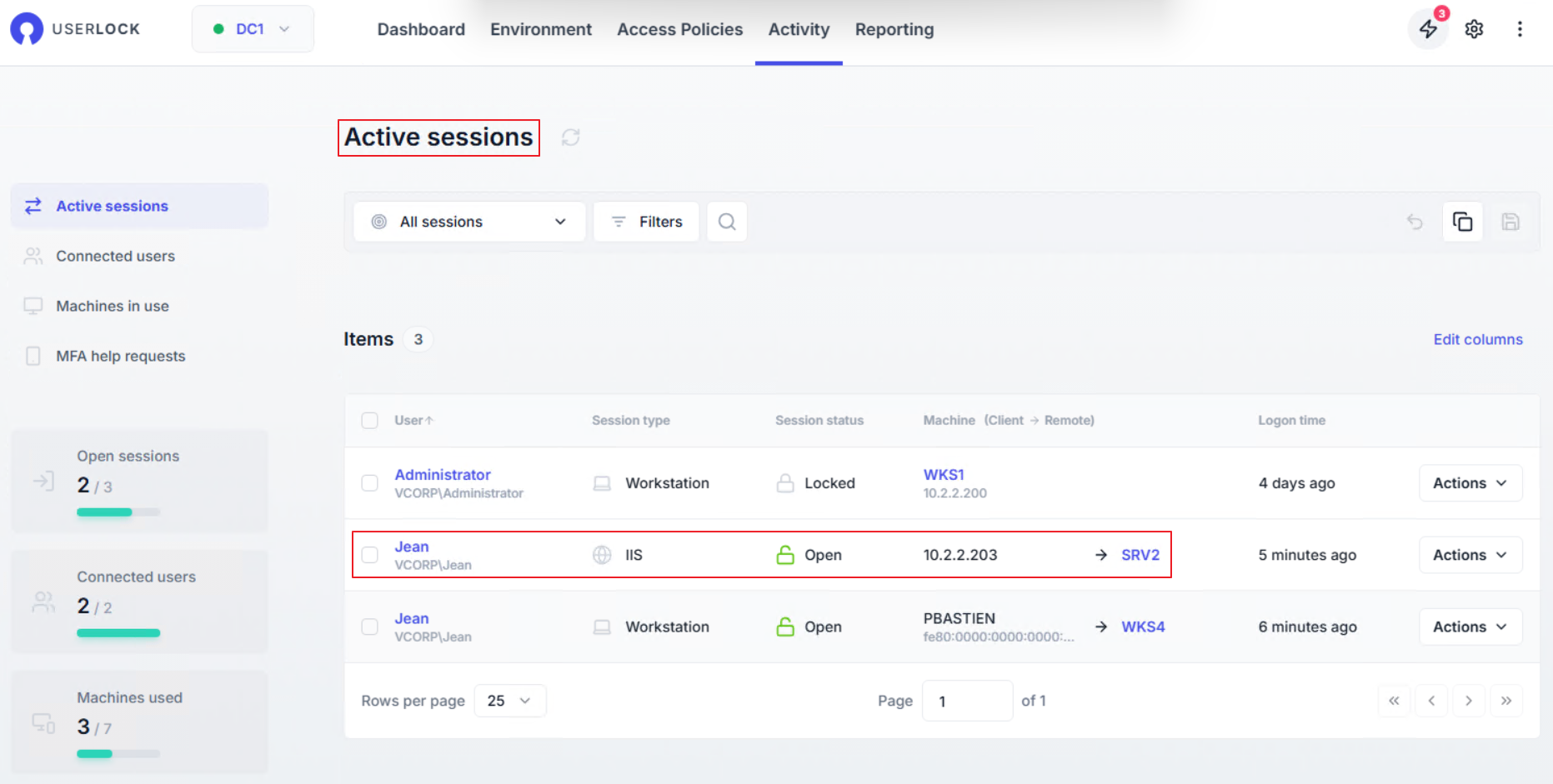 Dans la console UserLock, accédez à Activité ▸ Sessions actives.