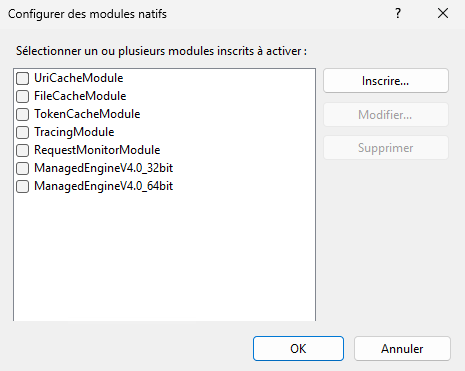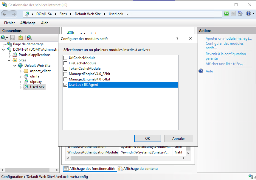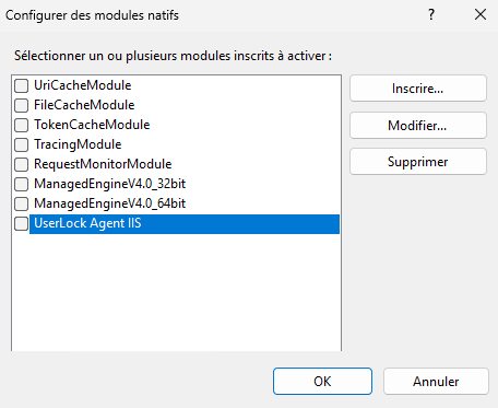 Au niveau du serveur, ouvrez Modules → Configurer les modules natifs…, sélectionnez UserLock IIS Agent, puis cliquez sur Désenregistrer.