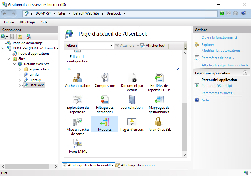 Après le déploiement, configurez le module UserLock dans IIS Manager.
