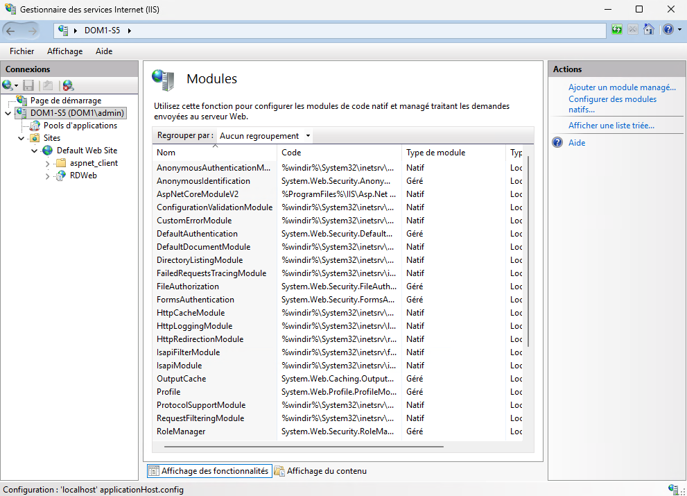 Dans le panneau Actions, cliquez sur Configurer les modules natifs….
