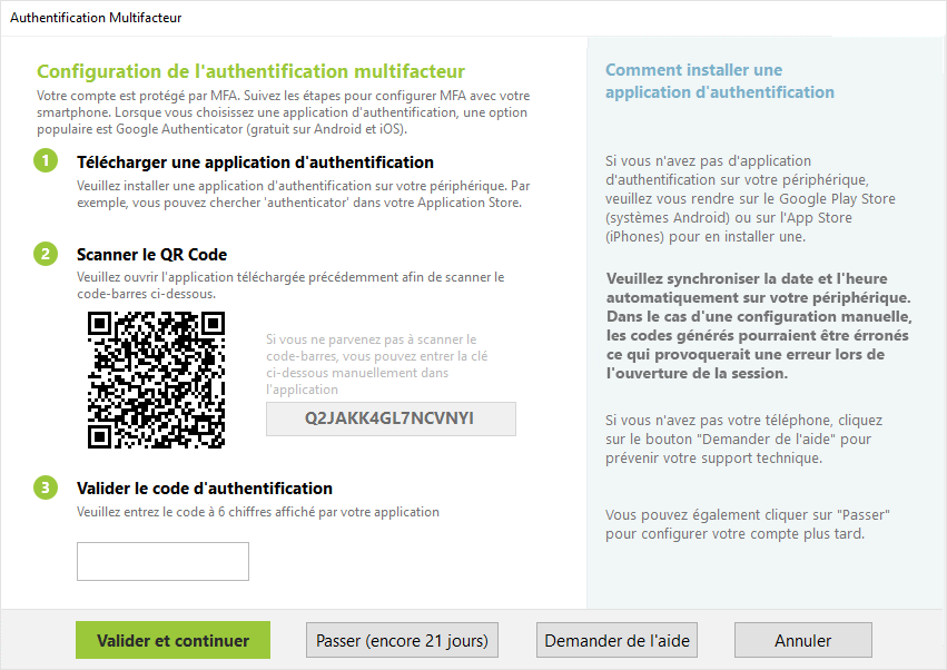 De l’accès à la fenêtre d’enrôlement UserLock affichant le code QR (visible lors de la première connexion quand la MFA est activée pour votre compte)