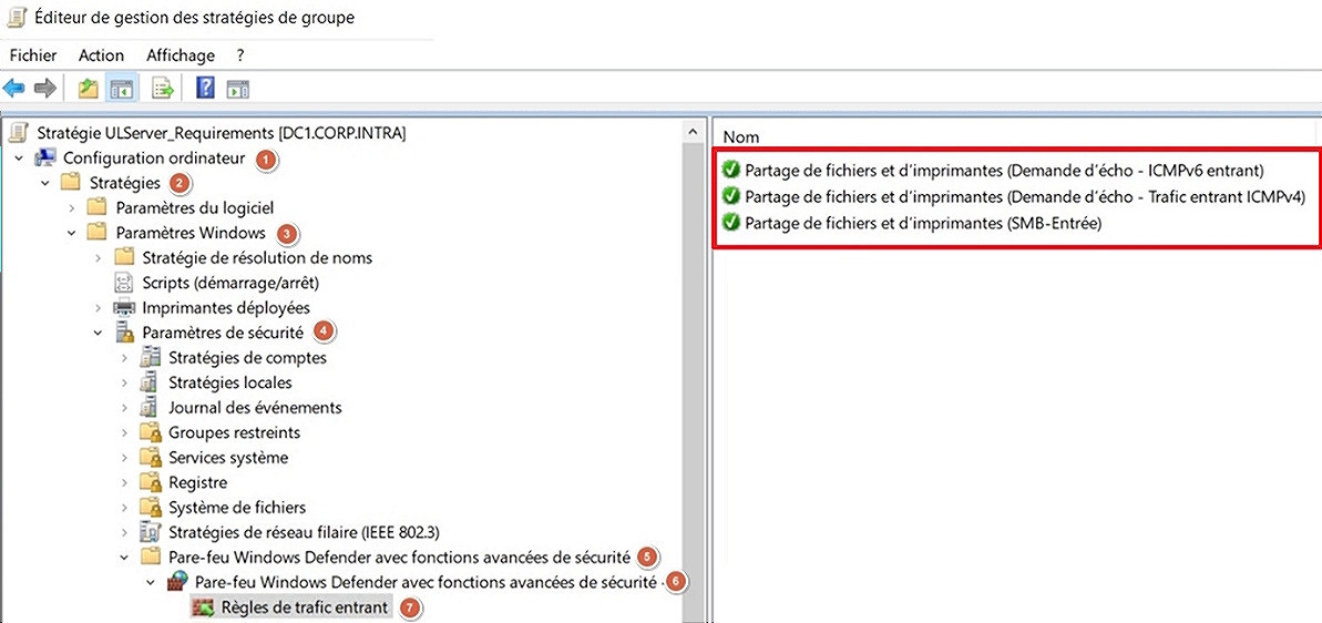 Configuration ordinateur → Stratégies → Paramètres Windows → Paramètres de sécurité → Pare-feu Windows Defender avec fonctions avancées de sécurité → Règles de trafic entrant