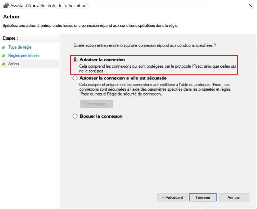 • Configurez les règles entrantes pour autoriser les connexions provenant de la plage d’adresses IP des postes protégés.