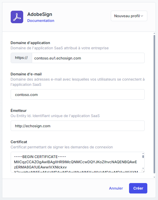 contoso.com).Certificat : collez le certificat Adobe Sign téléchargé à l’étape 1.