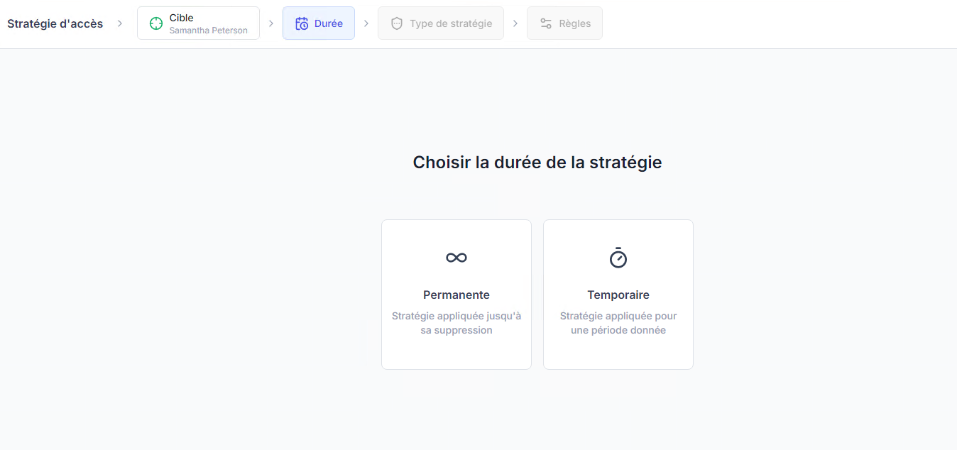 • Temporaire → Les règles s’appliquent sur une période donnée. Pour plus de détails sur la gestion des stratégies temporaires et des conflits, voir Stratégies temporaires (Référence).