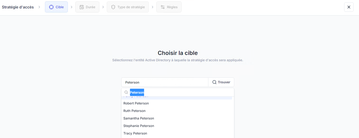 1. Vous devez d’abord choisir le type de cible sur lequel la stratégie d’accès sera appliquée. La cible est un objet de votre Active Directory et peut être un utilisateur, un groupe ou une unité organisationnelle.