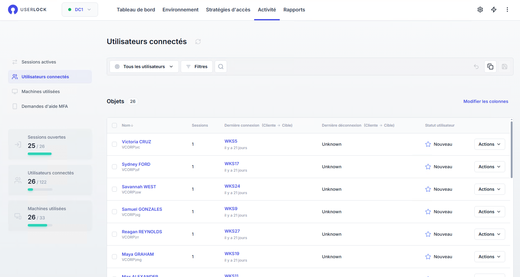 La section Activité offre une visibilité en temps réel sur les sessions, les utilisateurs, les machines et les demandes MFA. Elle est conçue comme un outil de support pour permettre aux administrateurs de surveiller l’activité et de réagir instantanément en cas de besoin.