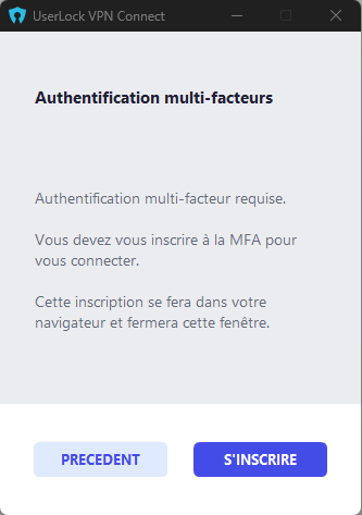 Si l’utilisateur n’est pas encore inscrit à la MFA, un bouton S’inscrire ouvre la page web IIS MFA de UserLock pour une inscription à distance.