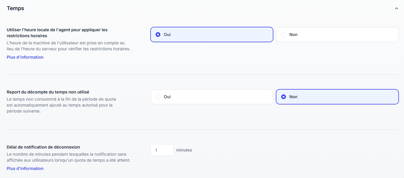 Délai de notification de déconnexion | Définit la durée d’affichage du message d’avertissement avant la déconnexion lorsqu’un utilisateur atteint son quota de temps.