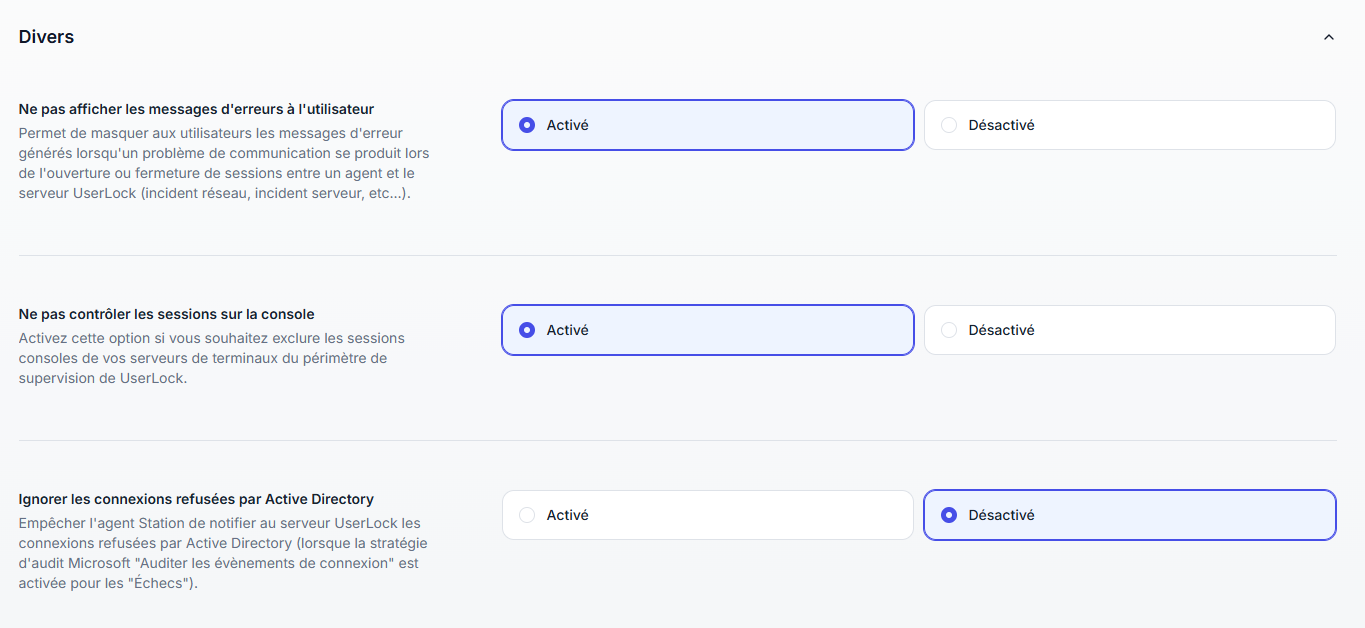 Ne pas afficher les messages d'erreurs à l’utilisateur | Masque les messages d’erreur susceptibles d’apparaître lors de la connexion/déconnexion si un problème de communication survient entre l’agent et le serveur UserLock (ex. panne réseau, problème serveur). |