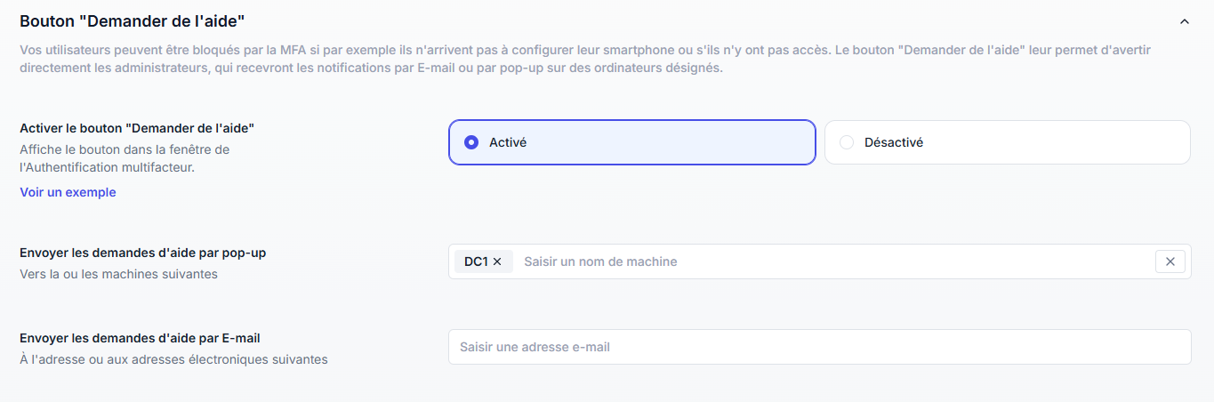 Le bouton Demander de l’aide permet aux utilisateurs de solliciter l’assistance d’un administrateur s’ils ne parviennent pas à réaliser la vérification MFA (ex. perte de l’appareil, absence de réseau).