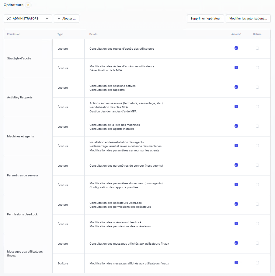 La page Permissions définit qui peut administrer UserLock et quelles actions chaque opérateur est autorisé à effectuer.