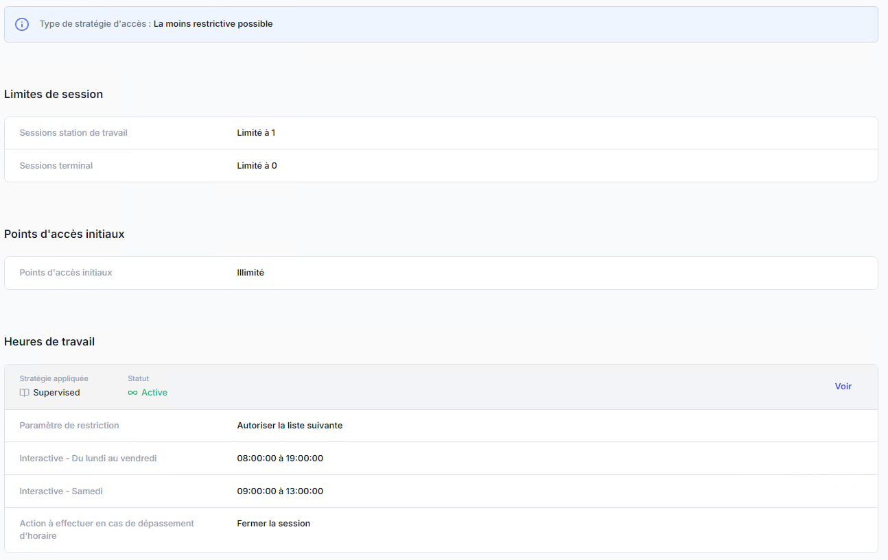 Tableau de bord d’un utilisateur, d’un groupe ou d’une UO → Stratégies d’accès → onglet Configurées → cliquer sur la stratégie.