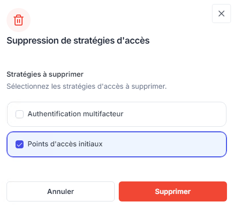 Depuis une page spécifique de type de stratégie (ex. MFA, limites de session, géolocalisation) : l’action Supprimer affiche une simple confirmation avant suppression.