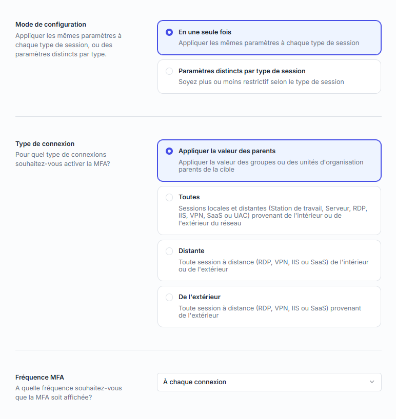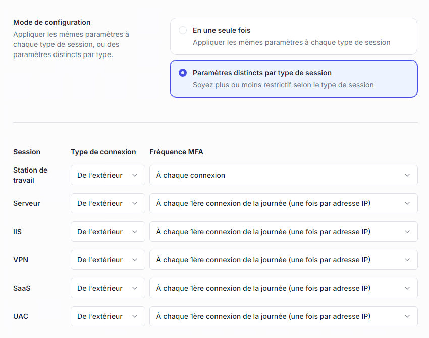Distantes | Appliquer la MFA uniquement aux sessions distantes (RDP, VPN, IIS, SaaS). |