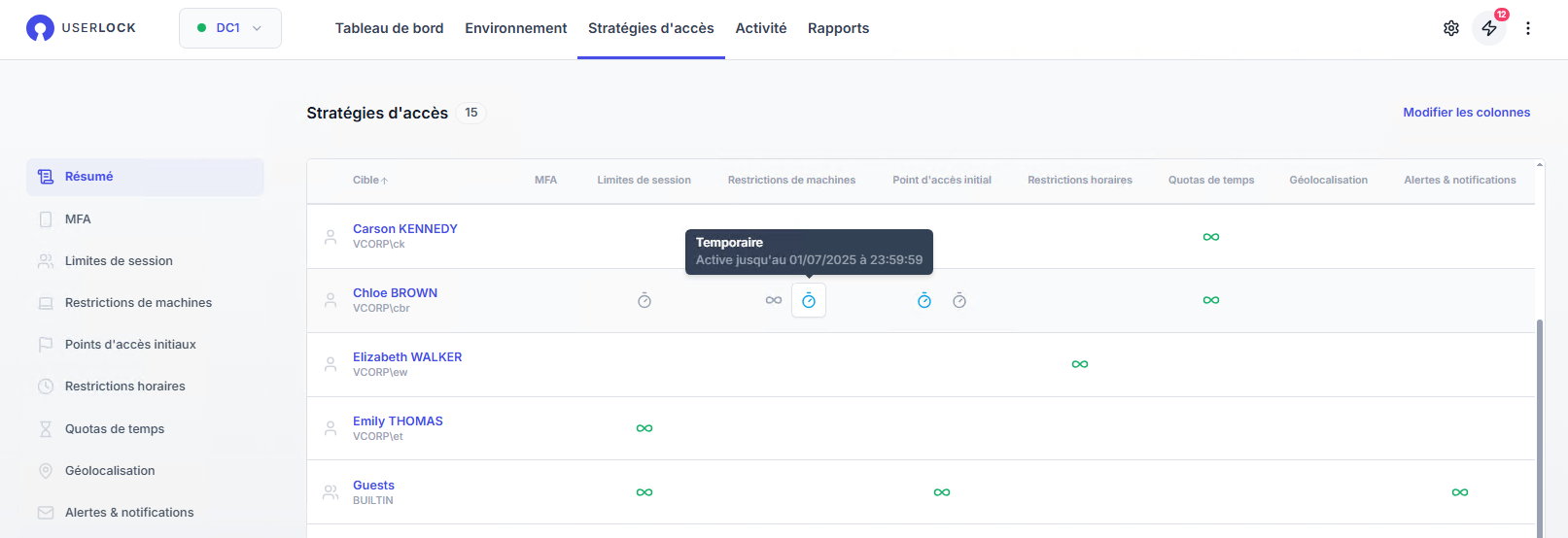 Les stratégies temporaires sont des règles d’accès applicables uniquement pendant une période de temps définie. Elles permettent d’accorder ou de refuser un accès de manière ponctuelle, par exemple pour autoriser exceptionnellement l’accès d’un utilisateur, ou pour restreindre l’accès d’une personne en congé.