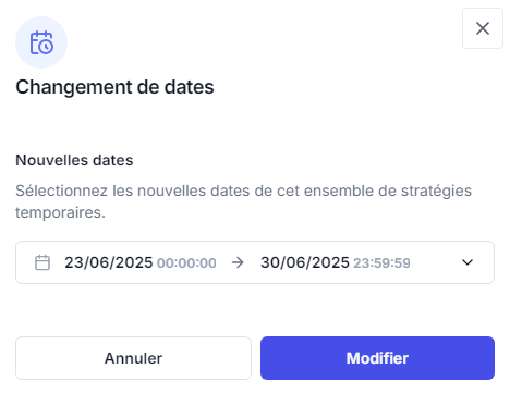 L’action Modifier les dates ouvre une boîte de dialogue avec des sélecteurs de date et d’heure, permettant d’ajuster le début et la fin de la stratégie. Toute modification prend effet immédiatement après l’enregistrement.